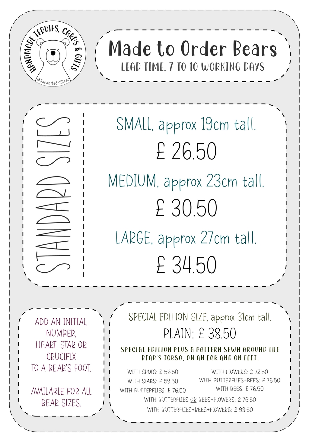 I will confirm all the details before starting a custom order. Any spelling mistakes or colour changes will result in further charges to rectify the mistake/changes. Please double check all names, information and the details of your bear before you confirm the order.