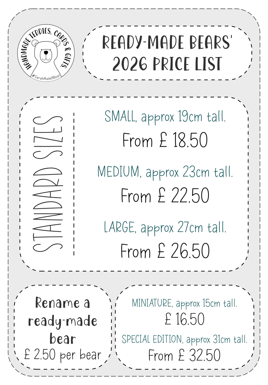 A new option I've introduced is to re-name a ready-made Bear that's already in stock - this service is just £2.50 on top of the Bear's price. The Bear's tray and neck label will be made again with the chosen new name printed on them. Priced per Bear.