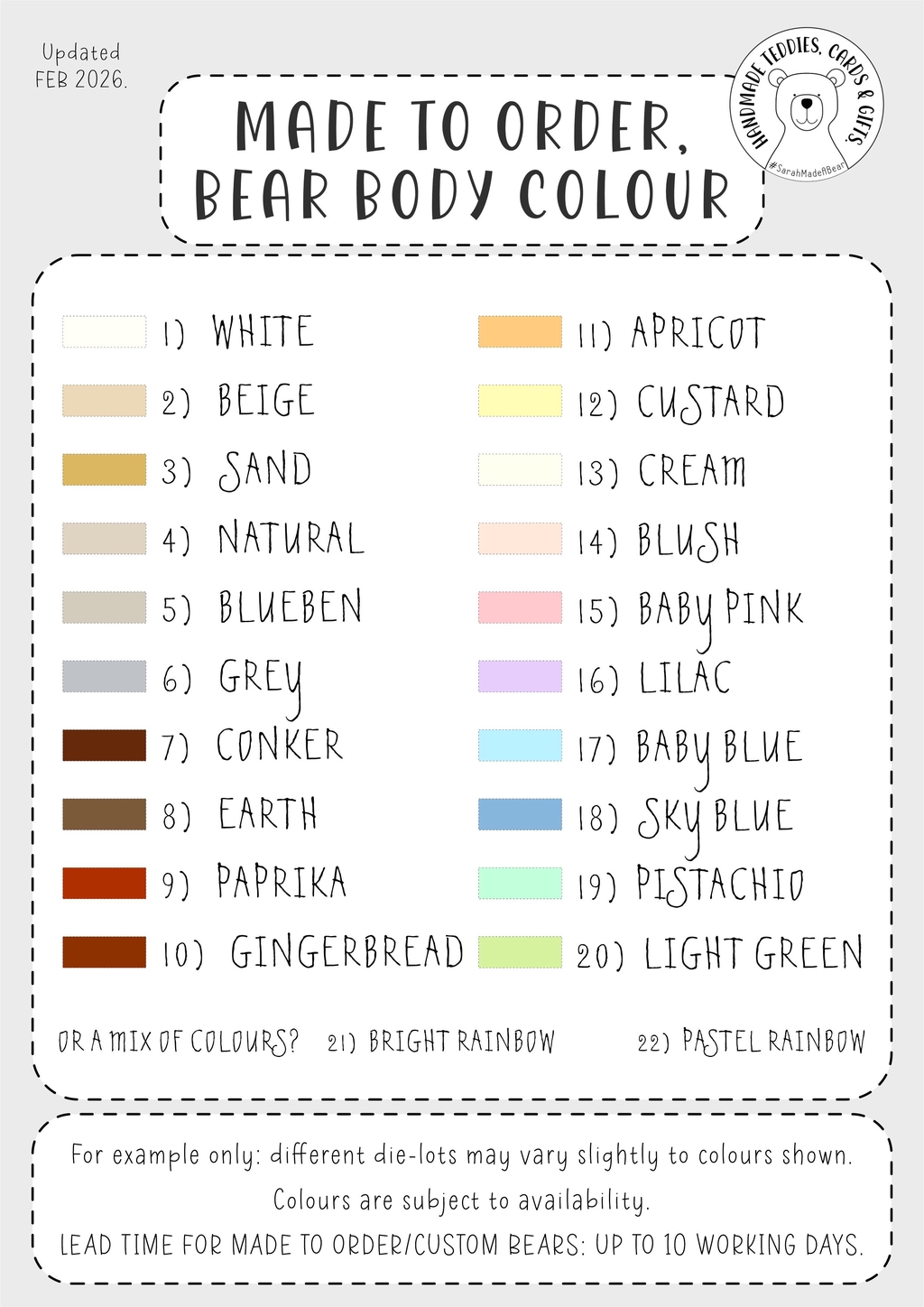 Email me on sarah@handmadeteddiescardsgifts.co.uk or click on the 'Contact Sarah' button below and ask for help if you're needing a Bear made just for you. I will email you to order and then, once all details are confirmed, you will get an invoice to pay via bank transfer or online through SumUp.