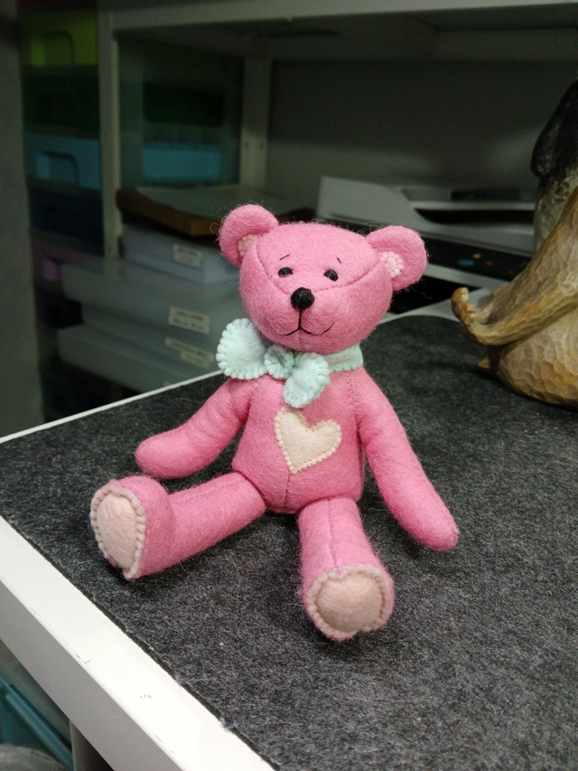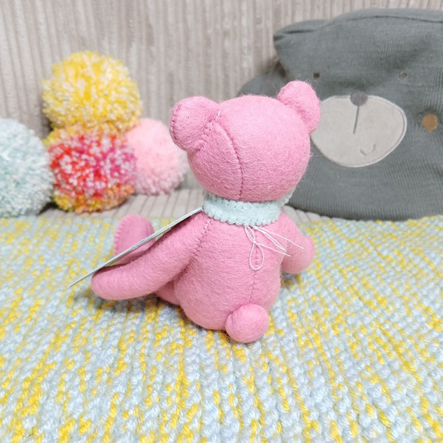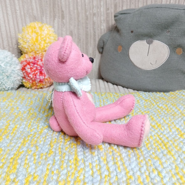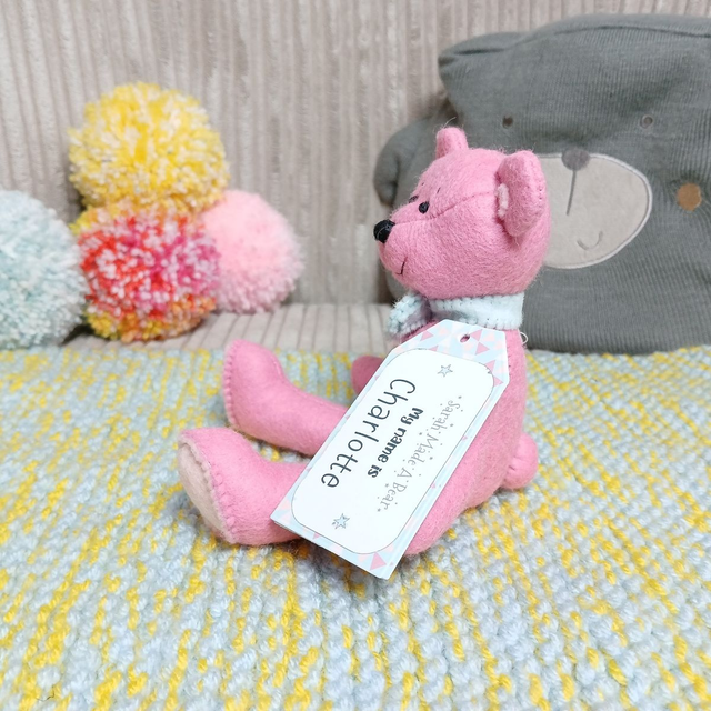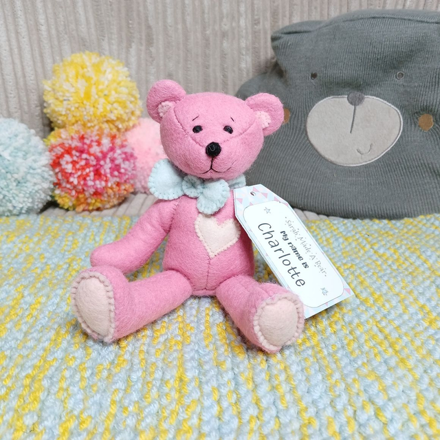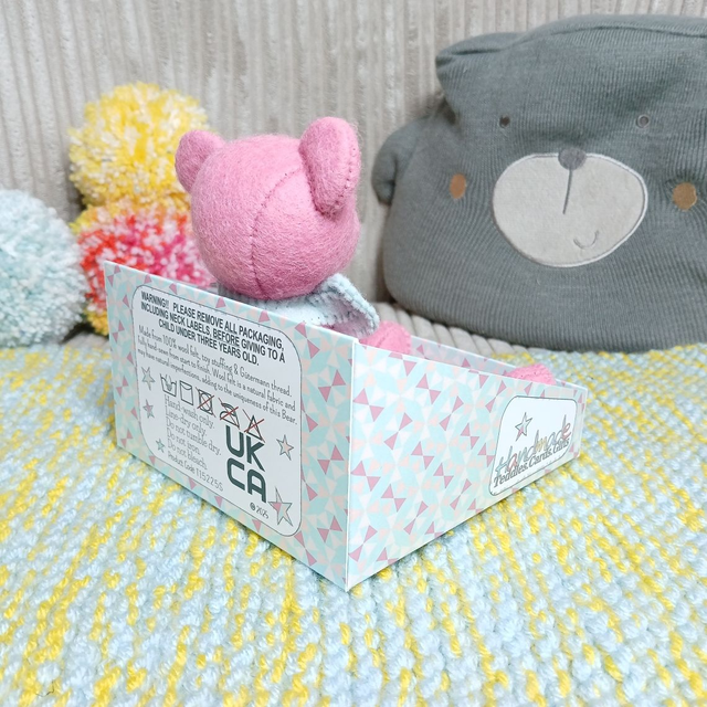 Charlotte. Small size, handmade teddy bear. UKCA. Tray base packaging. Standard Wool Felt. Cherry blossom pink. Spearmint. Blush. Baby Pink.