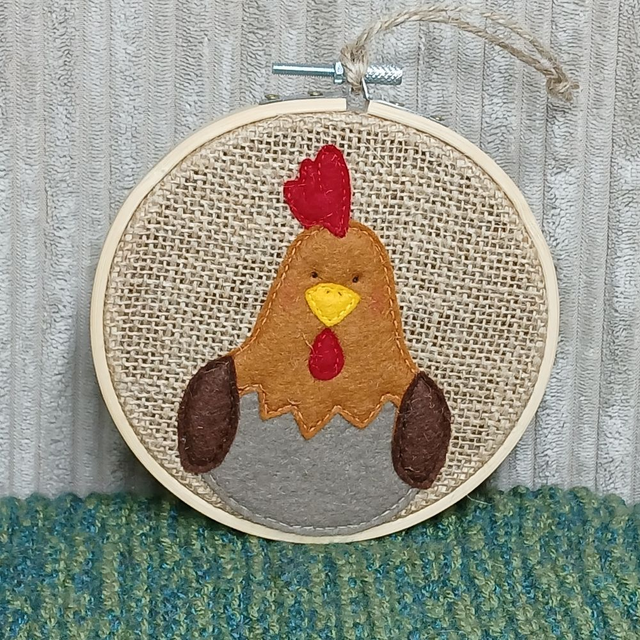 Farmyard Range, hoop art. Chicken design. Made with wool felt, hand-sewn onto hessian Wall art.