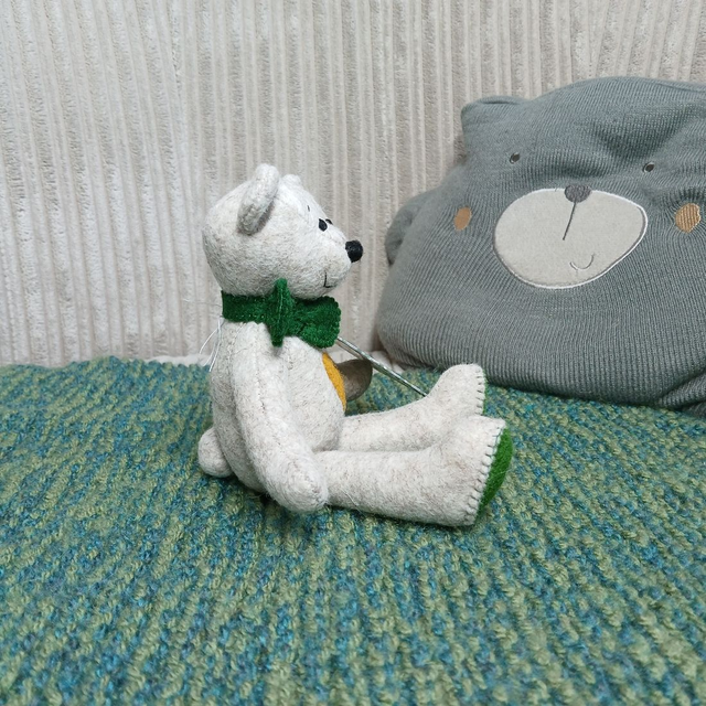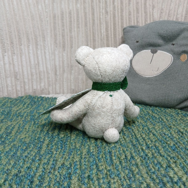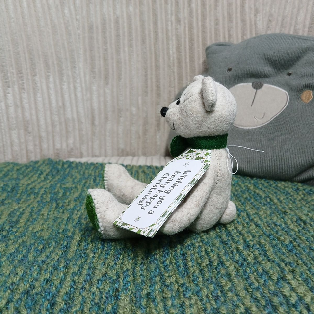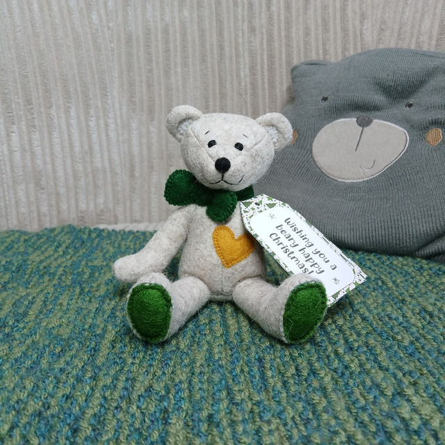 Green Bow Tie. Label: 'Wishing you a beary happy Christmas!' Small size, handmade teddy bear. UKCA. Standard Wool Felt. Traditional beige. Mustard.