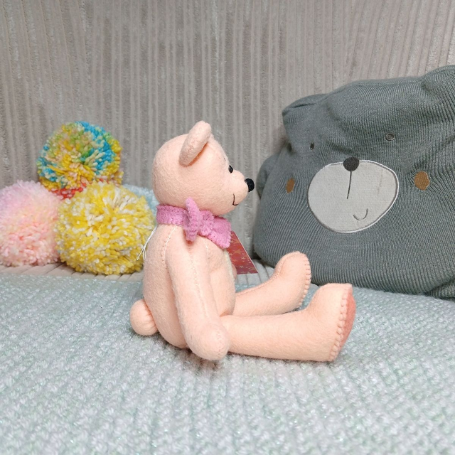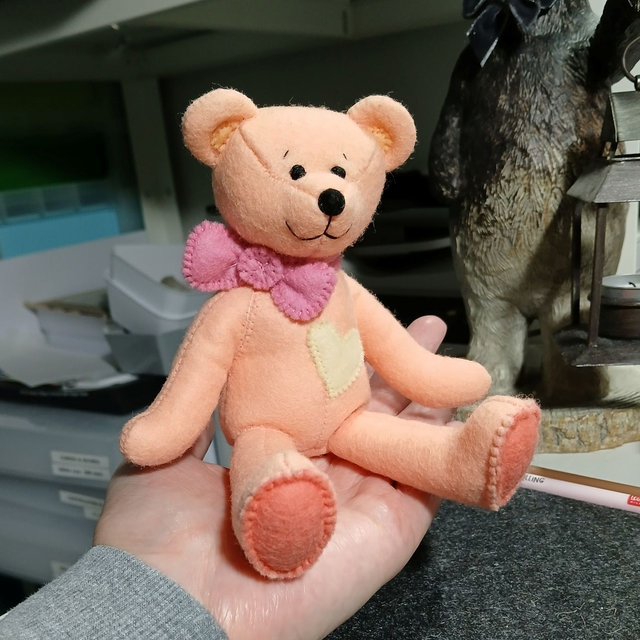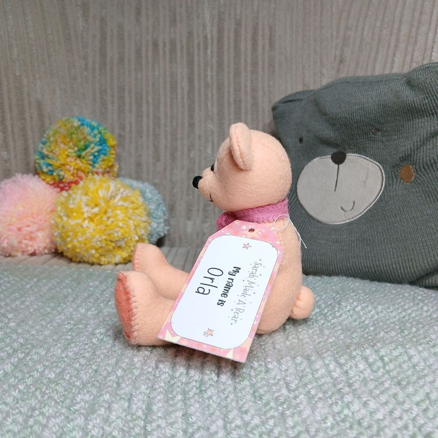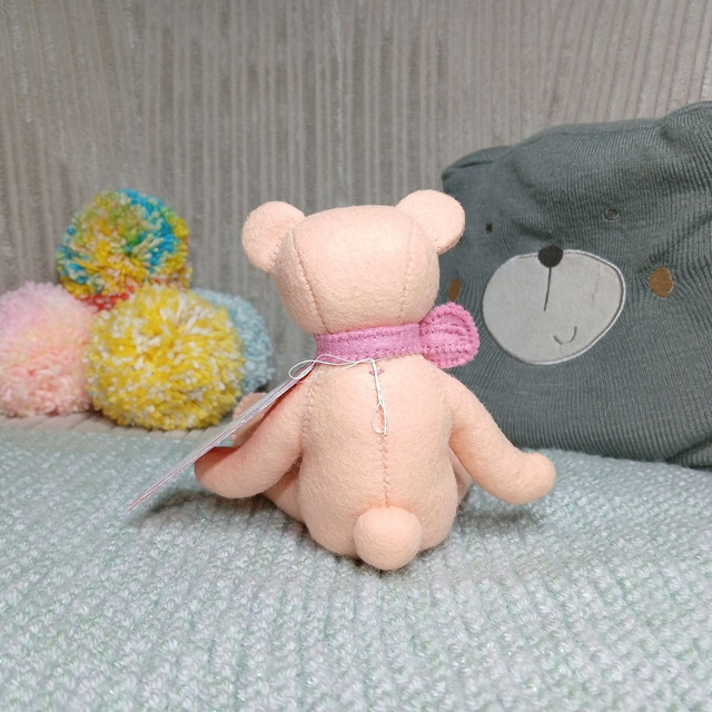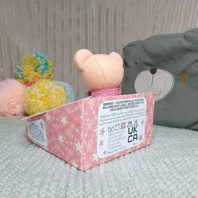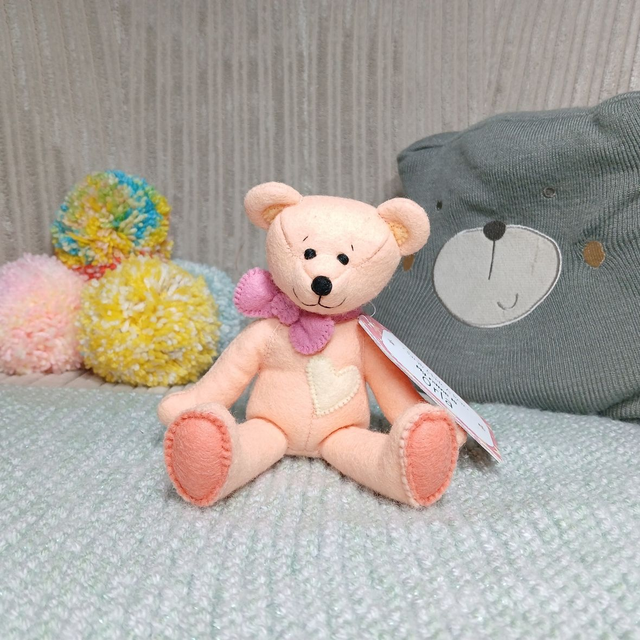 Orla. Small size, handmade teddy bear. UKCA. Tray base packaging. Standard Wool Felt. Peach. Pastel orange. Pink. Yellow.