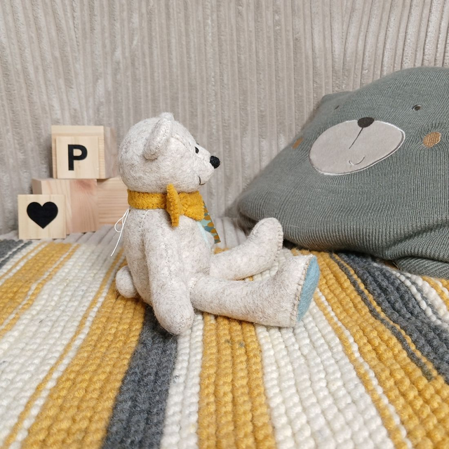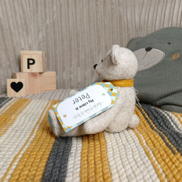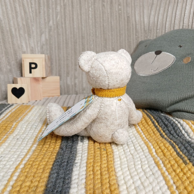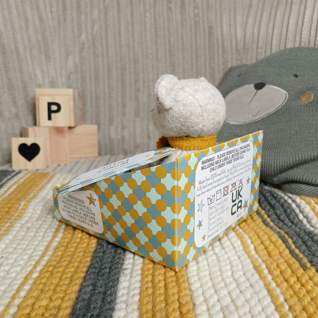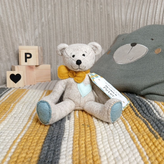 Peter. Small size, handmade teddy bear. UKCA. Tray base packaging. Standard Wool Felt. Beige. Mustard. Dusky blue. Spearmint.